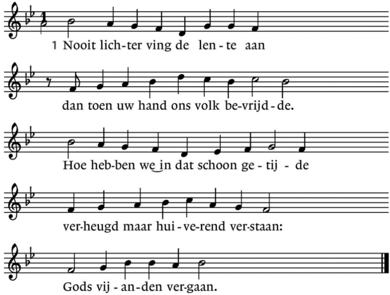Willem Vogel heeft met zijn beeldende toonzetting een eigen bijdrage aan de draagkracht van dit lied gegeven. De melodie is samengesteld uit citaten van liederen in de stijl van de Nederlandse volkslied traditie. Opmerkelijk is de melodie van de eerste regel ‘Nooit lichter ving de lente aan’. Deze is ontleend aan de eerste regel het slotkoraal van de Johannes Passion van Johan Sebastiaan Bach, een melodie als een hartekreet: